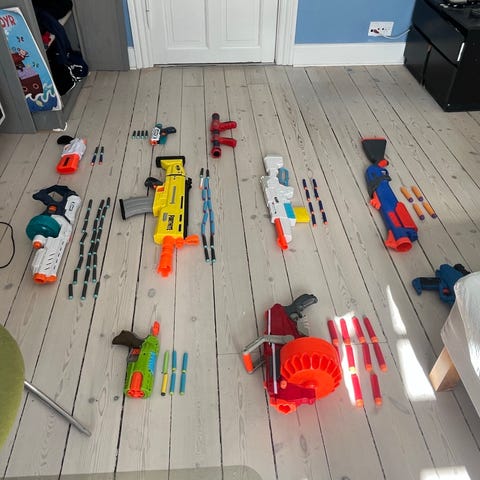 Nerf legetøjsvåben sæt med flere skumdartblastere og tilbehør. Sættet indeholder forskellige typer blastere i primært blå, orange og gule farver samt tilhørende skumdartpile og magasiner. Egnet som legetøj til børn, der leger skydespil eller rolleleg med Nerf-udstyr. Alle dele er lavet i plast med skumpile som ammunition.