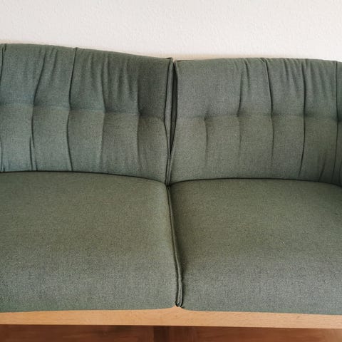 2 personers sofa og 2 spisestole med mahogni med rødt/bordeaux kraftigt og velholdt stof.