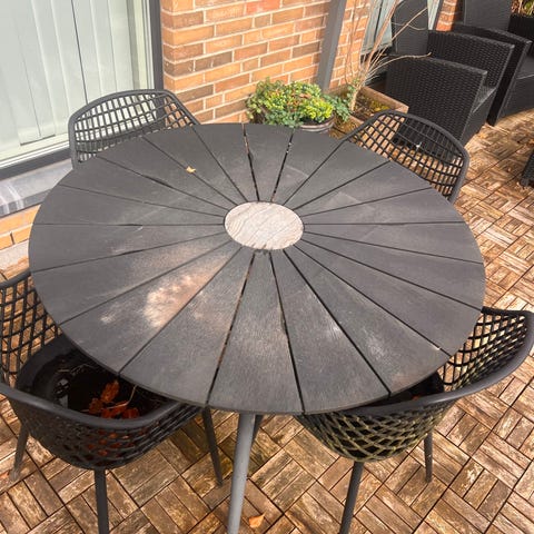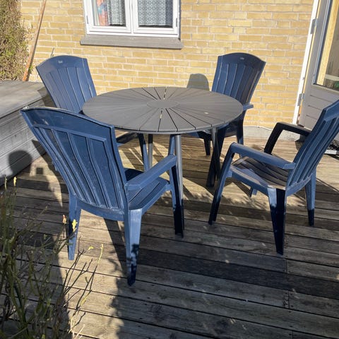 Rundt havesæt plast bord og stole med parasol hvid