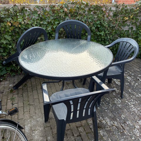 Rundt havesæt bestående af et rundt bord og flere stole i hvid plast samt en parasol med flerfarvet mønster. Sættet er egnet til udendørs brug på terrasse, altan eller i have. Bordet har fire ben og hul i midten til parasolstangen. Stolene er matchende i hvid plast, nogle med hynder. Parasollen monteres i bordets midte og giver skygge over siddeområdet.