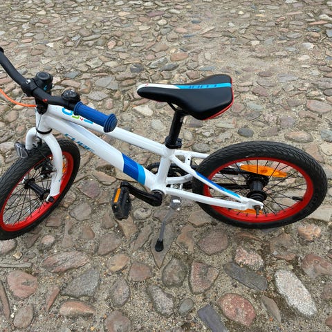 Cube børnecykel med 16" hjul i sort/grøn farve. Cyklen har lige styr, fodbremse og håndbremse foran samt reflekser i hjulene. Sadel og styrhøjde kan justeres, så cyklen kan tilpasses barnets højde.