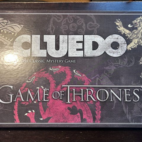 Clue Game of Thrones brætspil. Udgaven kombinerer det klassiske Clue-mysteriespil (tilsvarende Cluedo på det amerikanske marked) med universet fra Game of Thrones. Spillet indeholder spilleplade med to sider, figurer, kort, terninger, kuvert, blok til notater og øvrige spilledele som vist på billederne. Antal spillere og anbefalet alder fremgår af æsken. Velegnet til bordspil med familie eller venner, der kender Clue eller Game of Thrones-universet.