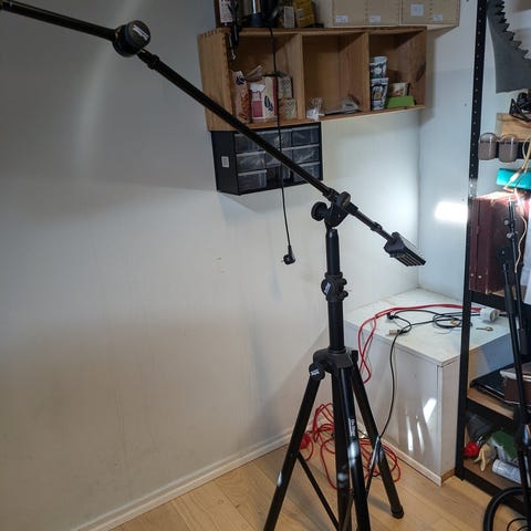 Isovox vokaloptageboks med stativ. Boksen er monteret på et højdejusterbart højtalerstativ (Roadworx Slim Line) med trebenet fod. Indersiden er akustisk behandlet for at reducere rumklang og udefrakommende støj under optagelse. Ydersiden er lukket, og fronten kan åbnes og lukkes efter behov.