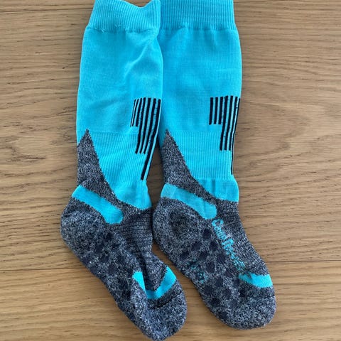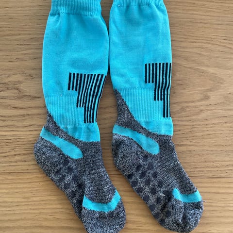Tykke Skistrømper til pige i størrelse 28-31. Strømperne er lyserøde med mørkere kontrastfelter og striber øverst. De er fremstillet i bomuld og formentligt uld som giver en blød og behagelig pasform til skituren.