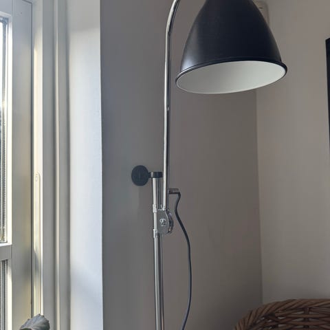 Gubi Bestlite væglampe i cremefarvet metal med kromdetaljer. Designet af Robert Dudley Best. Lampen monteres på væggen og har justerbar arm og skærm, så lyset kan rettes efter behov. Udstyret med ledning og afbryder på ledningen. Velegnet som læselampe ved sofa eller seng samt som arbejds- eller stemningsbelysning i stue eller soveværelse.