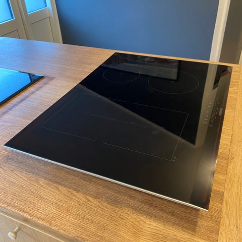 Siemens induktionskogeplade i sort glas. Kogepladen har flere induktionszoner og forskellige grydestørrelser med holde varm zone i midten.