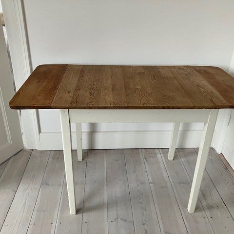Lille bord perfekt som spisebord til den lille lejlighed. Tror det er fra 70'erne, men har selv købt det brugt, så er ikke sikker. Har patina/brugsspor, men fremstår og fungere fint. Bordpladen er en form for træ med laminat - bordbene er metal.