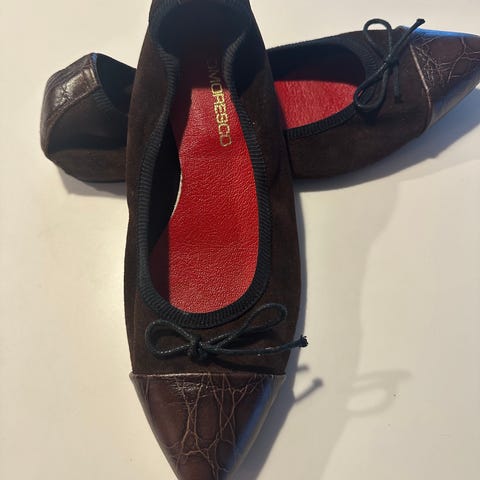 Rigtig flotte Luze ballerina sko i str. 39. Skoene er blå med dekorative udskæringer i overlæderet og kontrastsyninger langs kanter og sål. Indersålen er lys og let polstret med små perforeringer. Egnet som lette hverdagssko eller til brug indendørs, f.eks. på arbejde eller i fritiden.
