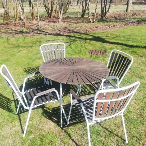 Rundt havebord med marguerite mønster og tilhørende 6 havestole sæt.