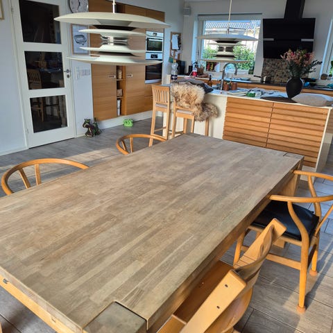 Massivt egetræ spisebord – med gemt 2 tillægsplade (1 hjemlavet)
