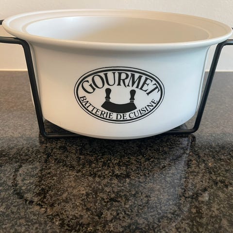 1. Gourmet, batterie de Cusine, hvid-grå, 26 cm i diameter og 10,5 cm høj, glasur-bobbel på den ene yderside, se billed 8, ellers som ny, 79 kr