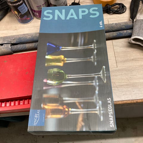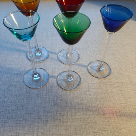 Farverige snapseglas fra Lyngby Glas. De måler 16 cm i højden. Aldrig brugt, har bare stået i et skab.