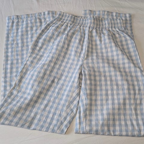 102 cm fra liv til ankel, 36 cm målt fra side til side i livet, og 31 cm fra liv (bagpå) til skridt.