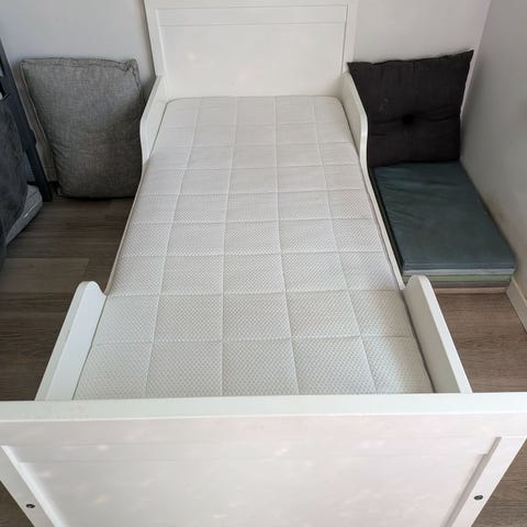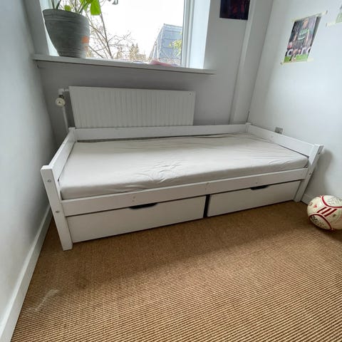 Junior sengen måler 80x160. Ny madras og to opbevaringskasser medfølger. Sengen har et lille hak, se billede.