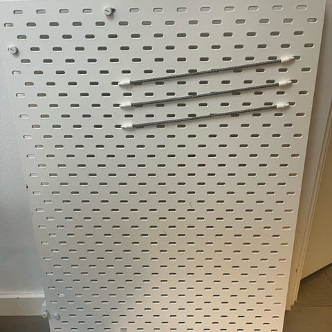 Hvidlakeret overflade med otte knager til nøgler eller andet ophæng.