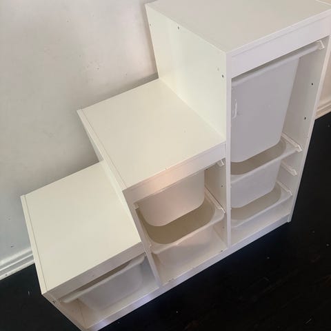 IKEA reol med opbevaringskasser i sort. Reolen har flere åbne hylder i forskellige højder samt integrerede plastkasser i hvid til opbevaring. Velegnet til børneværelse eller legeområde til organisering af legetøj, bøger og andre småting. Reolen kan placeres op ad en væg eller bruges som rumdeler afhængigt af indretning.