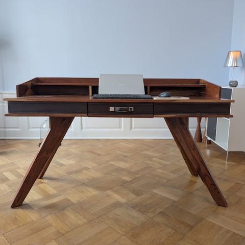 Custom-lavet skrivebord, lavet af gamle gulvbrædder. Brugt men i god stand. Se billederne for præcise målinger.