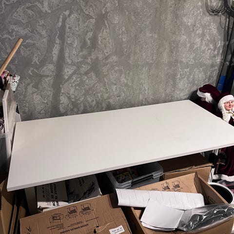 Hæve/sænke skrivebord med hvid bordplade og sort stel.