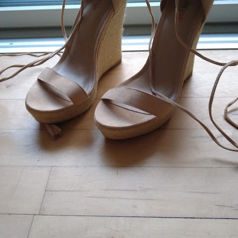 H&M sandaler i størrelse 40. Sandalerne har høj kilehæl med fletdetaljer i bastlook og remme i lys/hvid farve. Åben tå og hæl med ankelrem, der lukkes med spænde. Ydersål i gummi. Velegnet som sommersko til hverdag eller mere pænt brug.