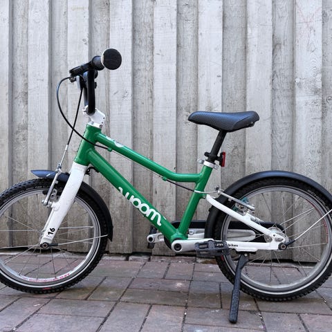Woom børnecykel med 16" hjul i grøn farve. Cyklen har lav indstigning og håndbremse både for og bag.