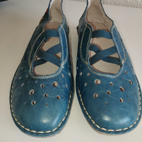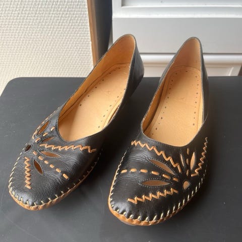 Pikolinos ballerina sko i str. 40. Skoene er i beige læder med udskårne blomsterdetaljer og synlige stikninger langs kanten. De har en lille rem over vristen og fleksibel gummisål med mønster for bedre fodfæste. Velegnet som lette hverdagssko.