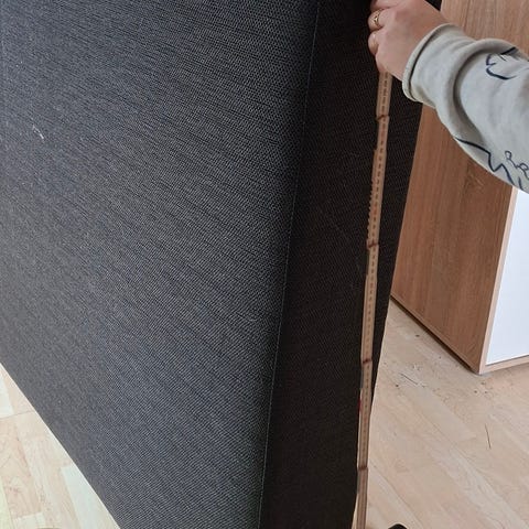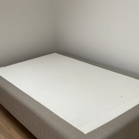 Boksmadras på ben, med næsten ny topmadras af memoryskum.