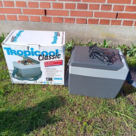 Let brugt køleboks der uden adaptor kan tilsluttes 12 volt i bilen/båden eller 220 volt hvor det er tilgængeligt.