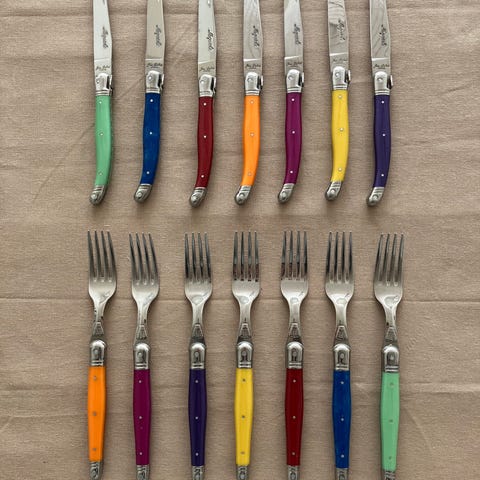 Smukt bestiksæt a 6 knive, gafler, skeer og teskeer fra Laguiole. Bestikket er i stonewashed rustfrit stål. Aldrig brugt.