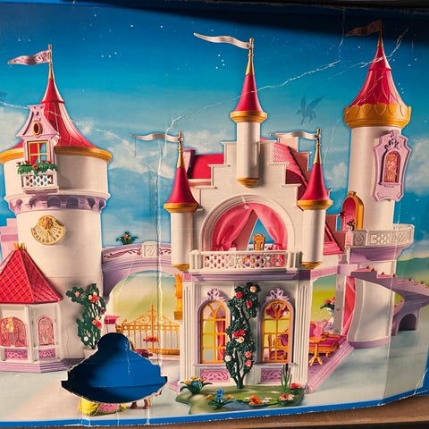 Det største Playmobil prinsesseslot. (70447) Sættet består af et stort slot med flere tårne, trapper, altaner og port. Slottet har åbne rum på bagsiden med plads til figurer og tilbehør. Der medfølger næsten alle de oprindelige lige dele og sætte er generelt velholdt. Derudover medfølger sæt 70454, som er et påklædningsværelse. Det ses på det sidste billede.