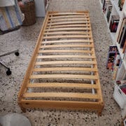 IKEA seng med madras i lyst træ og lys madras. Enkel enkeltseng velegnet til soveværelse, gæsteværelse eller børneværelse. Træsengen har en simpel ramme, og madrassen har quiltet overflade. Sengen er egnet til én person og kan bruges med almindeligt sengetøj i standard enkeltsengsmål.