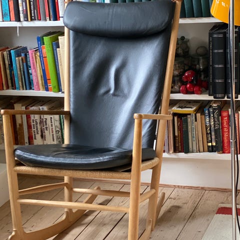 Hyndesæt til Hans J. Wegner gyngestol model J16 - både ryg- og sidde hynde. Der er sorte læder stropper på ryghynden, og passer derfor flot til stolen i sortlakeret stel.