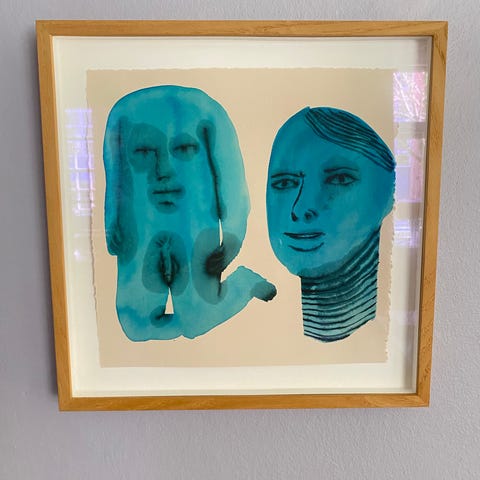 Guache figur forestillende farverigt figurmotiv ophængt svævende på sort baggrund. Motivet forestiller en stiliseret person omgivet af dynamiske, abstrakte former i flere farver.