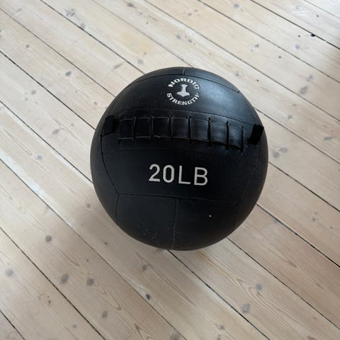 Nordic Strength wall balls i vægtene 10 lb (grøn) og 14 lb (blå). Overflade i syntetisk materiale med syninger og grebsstropper, som giver et stabilt greb ved kast og modtagning.