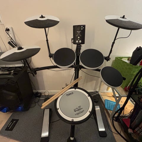 Her får du alt til opstart som trommeslager ( med eller uden lyd vel at mærke) der medfølger diverse ledninger samt trommestikker..