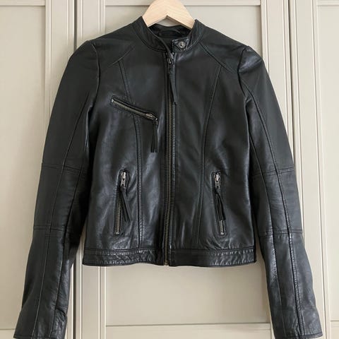 Jakken er sort og fremstillet i læder. Klassisk bikerinspireret model med asymmetrisk lynlås foran, lynlåslommer og lynlåse ved ærmerne. Skulderstropper med trykknapper og enkel ryg uden print eller mønster. Velegnet som overgangsjakke eller til brug over hverdagstøj.