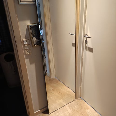Spejlet kan hænges op på væggen, men fungerer også fint stående op af væggen.