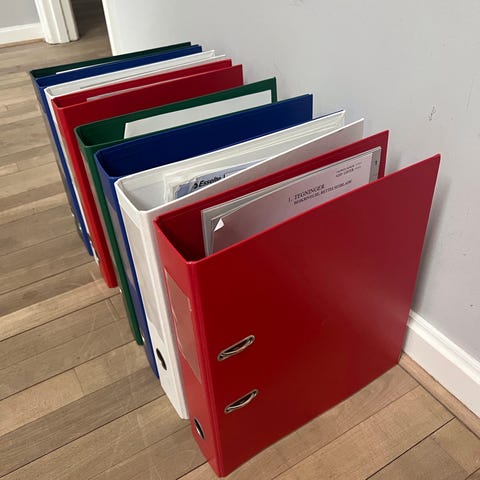 Røde ringbind i A4-størrelse. Standard kontor-ringbind med metalmekanisme og ryg med etiketholder.