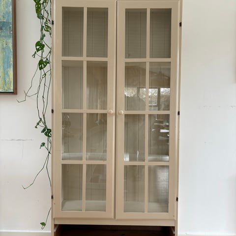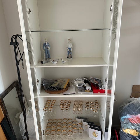 Ikea vitrineskab med slid på frontlågen, lidt huller i siden og bagved sælges pga. flytning. Det fejler ellers ingenting og kan også bruges til et hobbyprojekt.