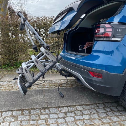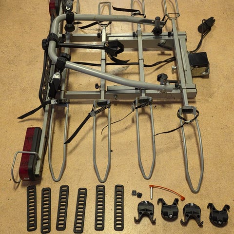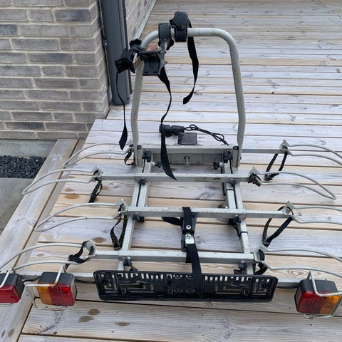 til anhængertræk med integrerede baglygter og plads til montering af nummerplade. Holderen har bøjle med justerbare holdere til fastgørelse af cykler samt skinner til hjulene. Velegnet til transport af cykler bag på bilen via anhængertrækket.