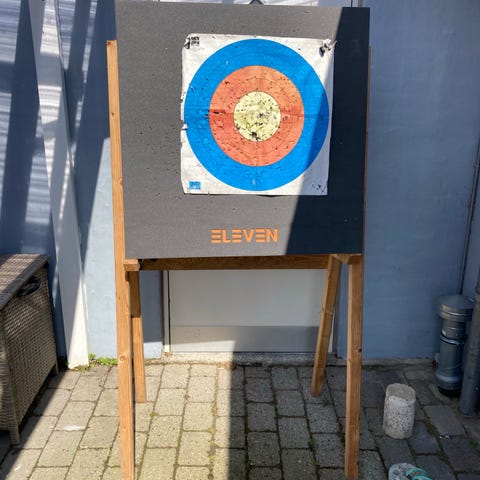2 buer med ekstra stykker og 10 pile. Har ikke været brugt i mange år. Været opbevaret i skur og har lidt patina.