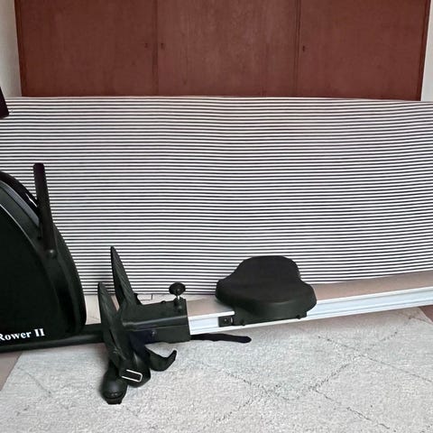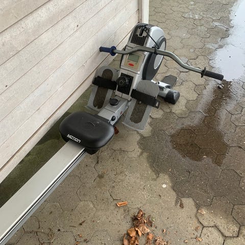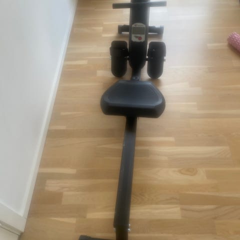 Epsilon romaskine med indbygget træningscomputer i sort. Maskinen har fodpedaler med skridsikker overflade og justerbare stropper samt et glidesæde på skinne. Træningscomputeren viser typisk data som tid, rotag, distance og lignende afhængigt af model. Velegnet til indendørs konditions- og styrketræning af hele kroppen.