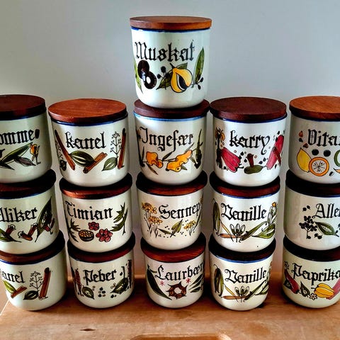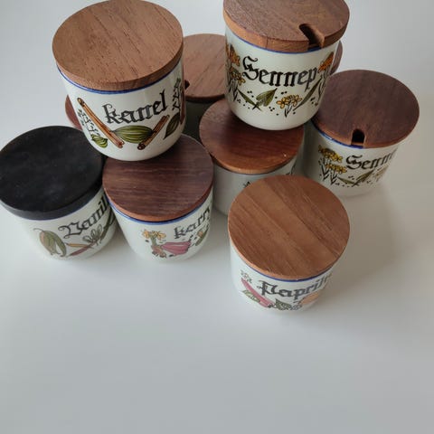 I alt 9 stk. Ingefær, Kardemomme, Bagepulver, Nelliker, Peber, Vanille, Peprika, Sennep, Kanel.