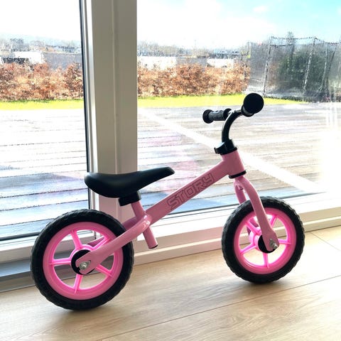 Børne løbecykel med 12" hjul i gul farve. Cyklen har hvidfælgede hjul, brun saddel og brune håndtag. Foran er der en flettet cykelkurv monteret på styret. Velegnet som løbecykel til mindre børn, der skal øve balance og styreteknik.