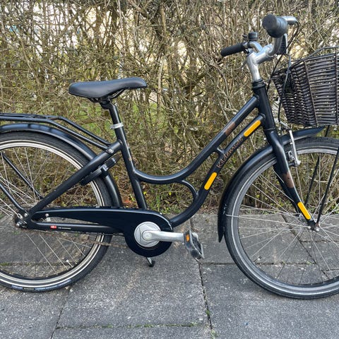 Købt i 2024 hos Bikeworld, kvittering haves. Passer til pige på 8-10 år. Incl lås, kurv og støttefod.