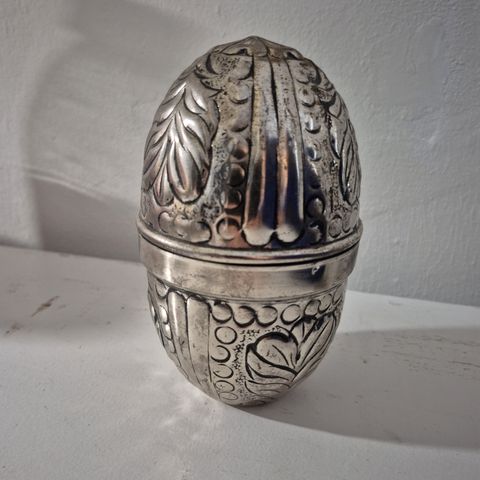 Sæt med fem dekorative æskeæg i sølvfarvet metal. Æggene har forskellige størrelser.