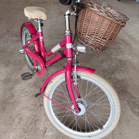 Godt brugt, med lidt rust. Pinepeak børnecykel med 20" hjul i turkis farve. Cyklen har klassisk stel med lav indstigning, bagagebærer og kædeskærm. Udstyret med brune håndtag og sadel samt lysfarvede dæk. Velegnet som hverdagscykel til børn i den størrelse, der passer til 20" hjul.