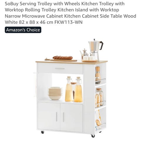 Køkkenbord på hjul i lyst træ med bordplade i hvide fliser. Bordet har en udtræksskuffe under bordpladen samt flere lamelhylder, heraf en med plads til flasker. På siden er der knager til ophæng, f.eks. viskestykker eller køkkenredskaber. Velegnet som ekstra arbejds- og opbevaringsplads i køkken eller spisestue. 38x48 cm, højde 88 cm.
