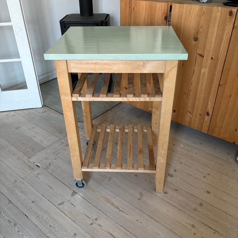 Køkkenbord på hjul træ med flisebordplade og hylder