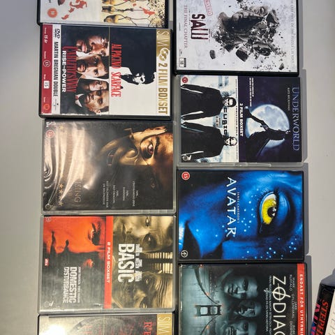 Blandet dvd filmpakke med forskellige film i originale dvd-covers. Pakken indeholder flere genrer, herunder action, thriller, drama og krimi, med titler som blandt andet Harry Potter, Twilight, Pulp Fiction, Inside Man, Sin City, S.W.A.T., Deja Vu, Blood Diamond, American Psycho, Taken 2, 21 og andre. Velegnet til samlere eller til hjemmebiograf med fysiske dvd-film. Antal og specifikke udgaver fremgår af billederne. Skal købes samlet, eller 4-5 af gangen, alt samlet koster 200, 4-5 koster 40-50 kr