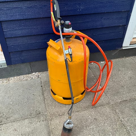 Solgt - Gasblus fritstående med slange blå